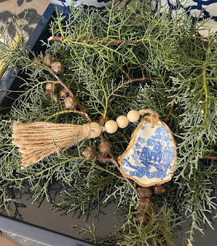 A tiny treasure from the sea, this small flat oyster shell has been reimagined into a festive 3 bead delight. Hang it on your tree, door knob, rearview mirror, tuck it into a gift, or let it sparkle as a keepsake that blends seaside whimsy with seasonal magic.