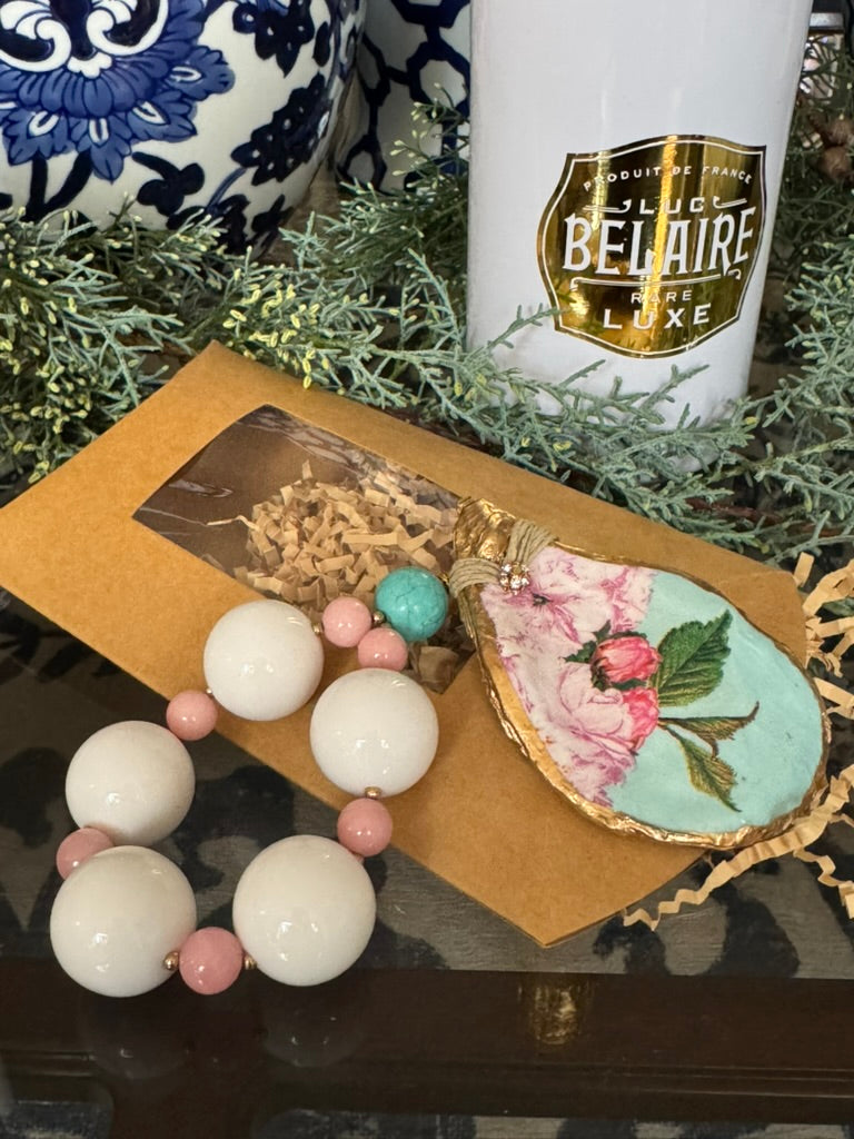 This shell is harvested from the east coast, hand selected, handcrafted and painted gold on the back and rim. Playful large white ceramic beads set the tone along with pink quartz stones and a round turquoise bead holding a beautiful flat Little Darling oyster shell, sporting a little bling to pull the whole gift together. Item arrives gift wrapped in the box shown. We can also include a note from you on a card inside.