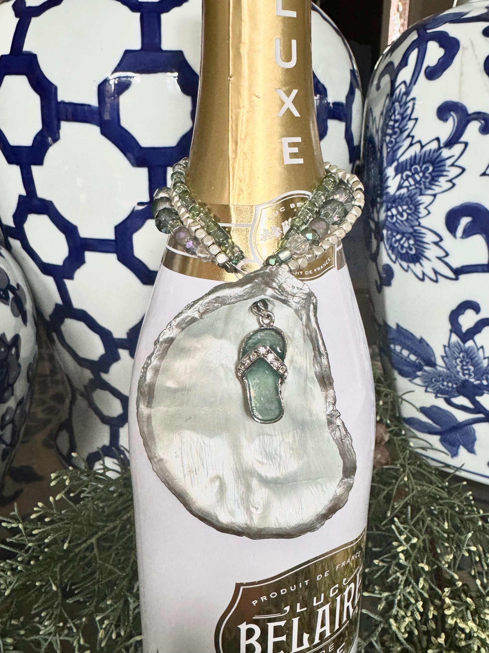 This shell is harvested from the east coast, hand selected, handcrafted and painted silver on the back and rim. Glass beads in all shapes and shades of ocean colors alomg with a little bling to pull the whole gift together. An adorable beach sandal resting on a beautiful flat Little Darling oyster shell. Item arrives gift wrapped. We can also include a note from you on a card inside.