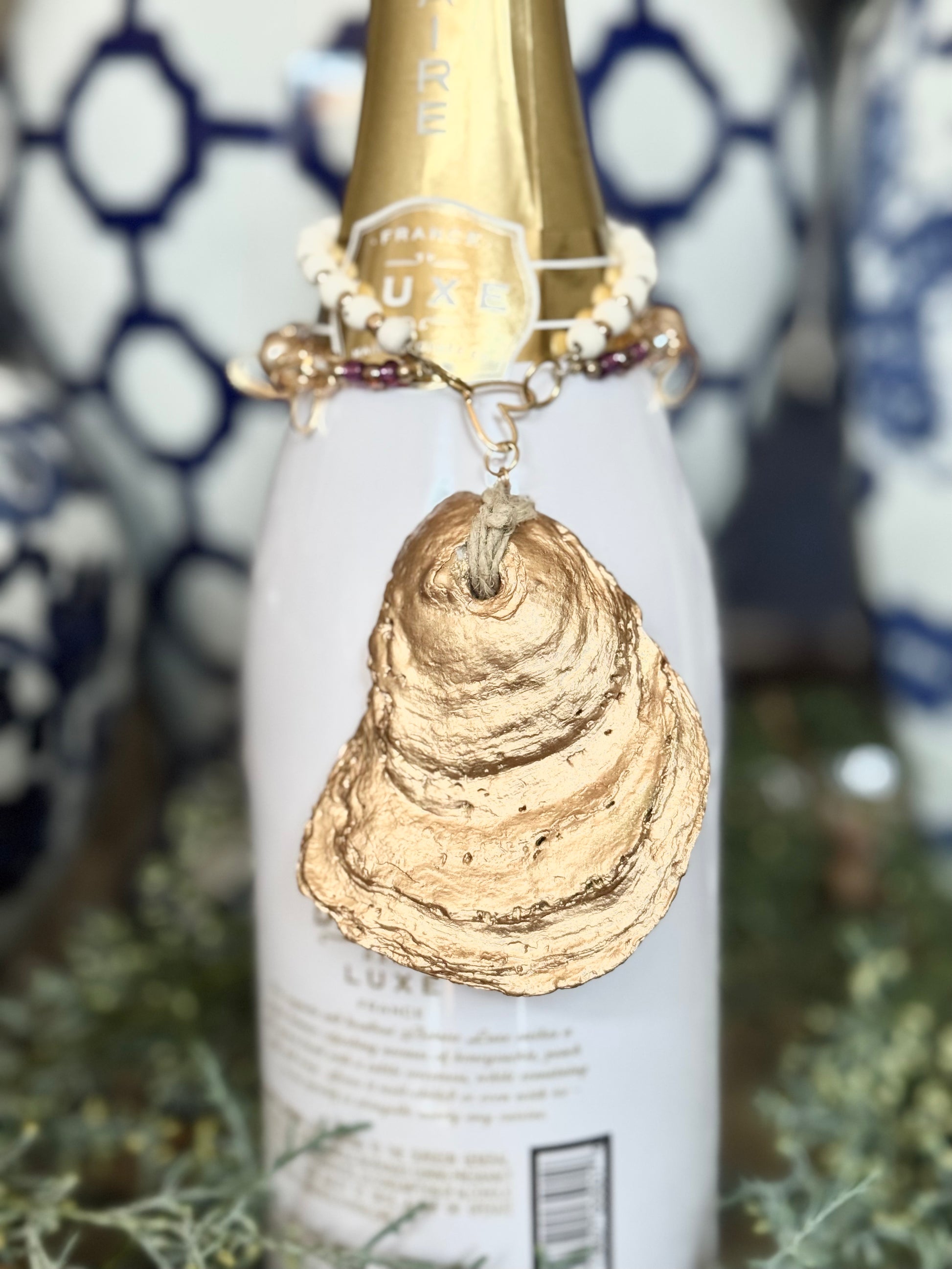 This shell is harvested from the east coast, hand selected, handcrafted and painted gold on rim and back, making it reversible. This shell is painted pale pink pearl and supported by dainty white wood, gold, pearl and purple glass beads, all complimented by gold metal hearts that hold up this beautiful flat Little Darling oyster shell. Item arrives gift wrapped in box shown. We can also include a note from you on a card inside.