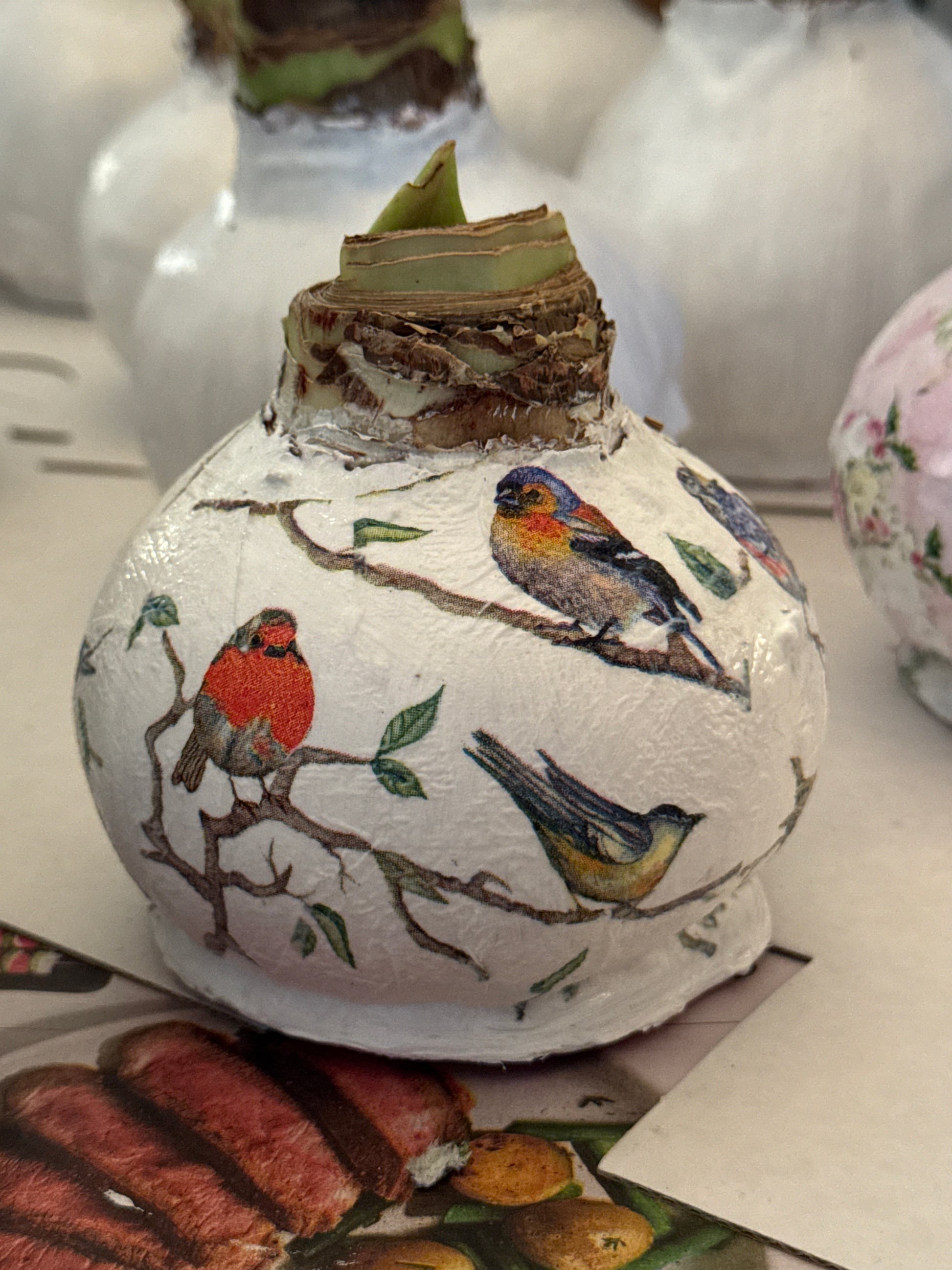 Beautiful large waxed bulb of Red Amaryllis decorated, wrapped in a beautiful bow and ready to go! Limited quantity, contact us for designs available.