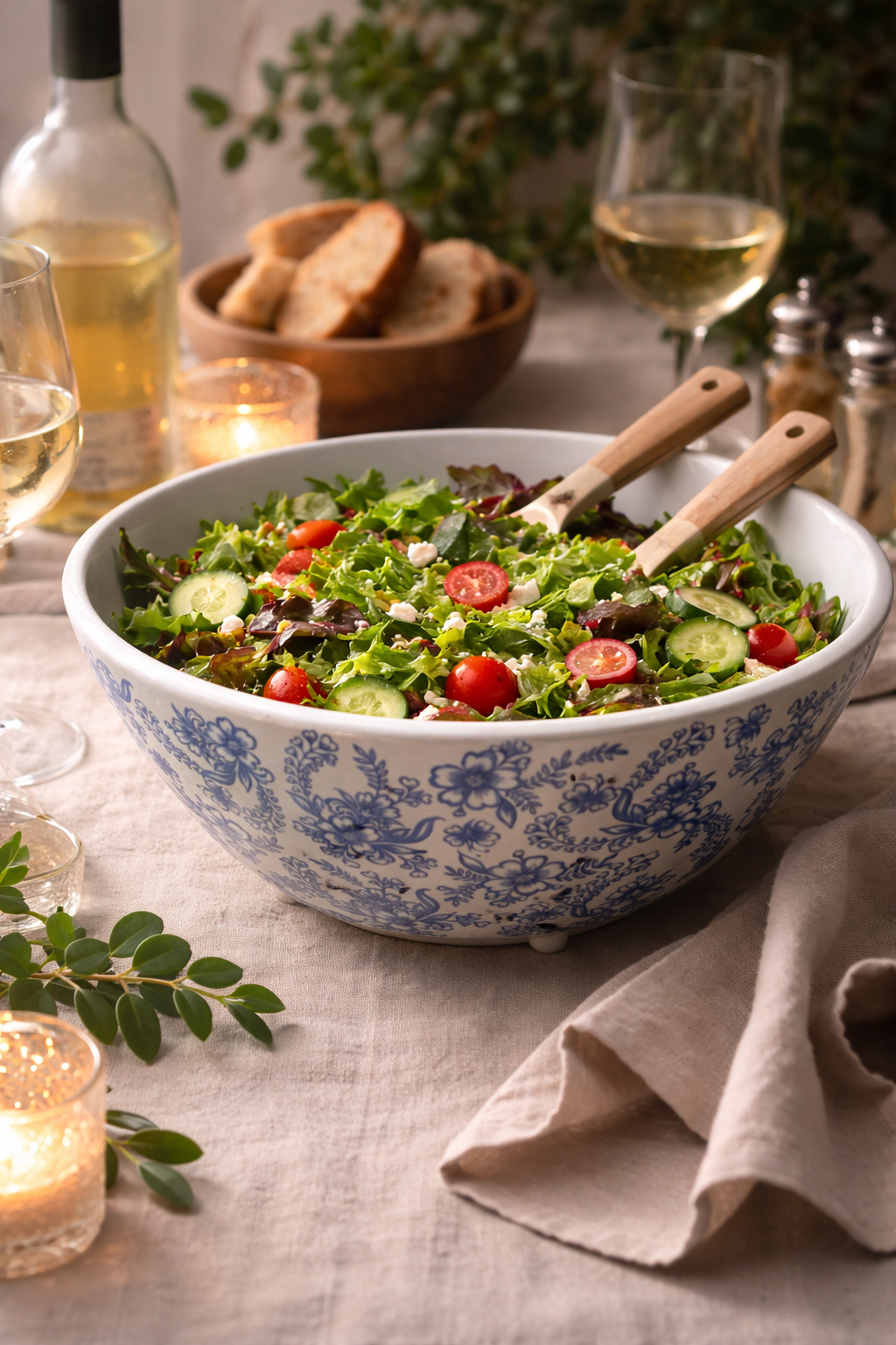 This piece was painted a soft white, decoupaged with blue & white floral motifs, elevated on round wood feet, and sealed with a food-safe finish — perfect for serving bread, displaying fruit, or even housing your favorite plant.