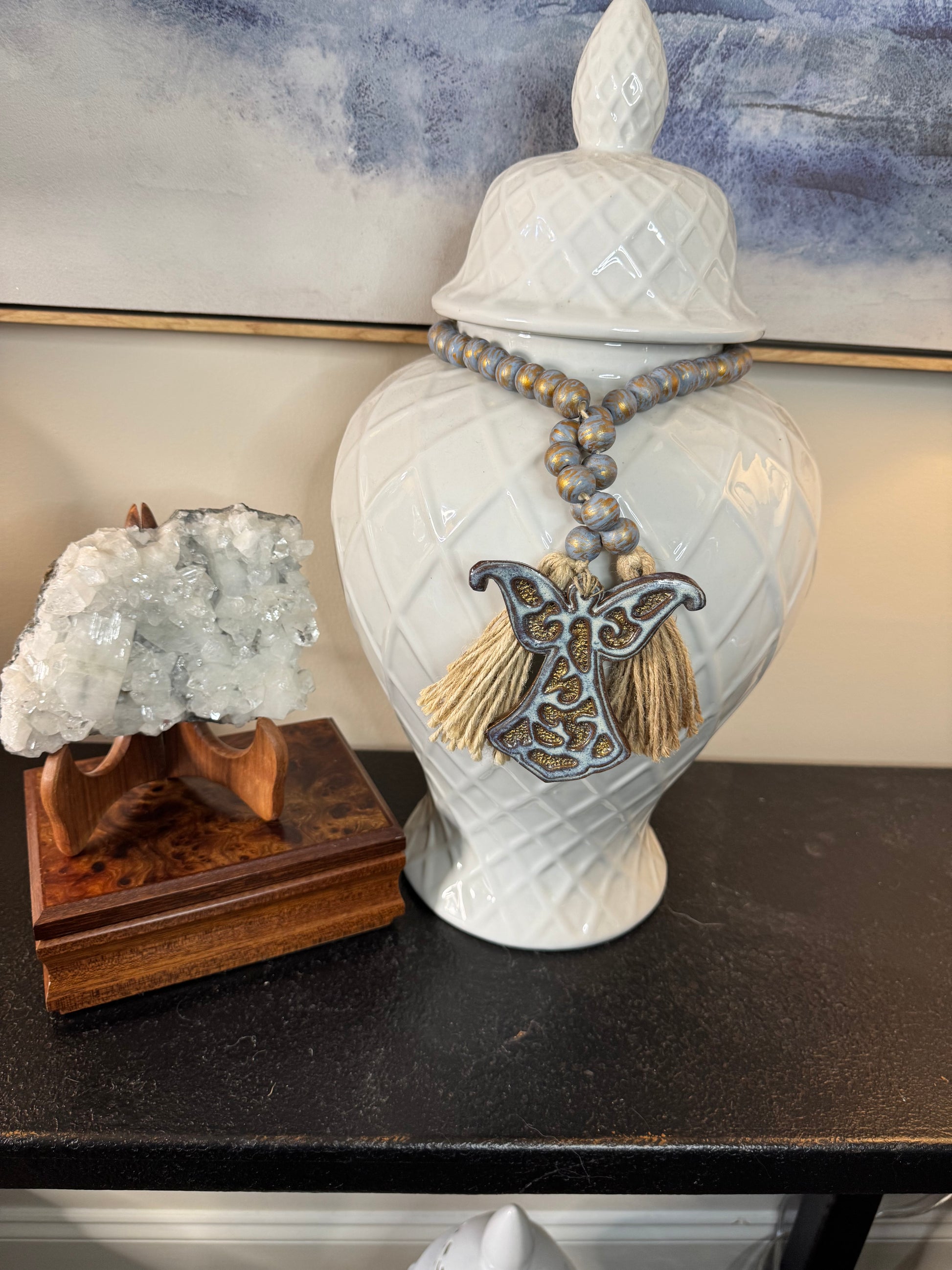 Dress up your space with this handcrafted garland featuring natural wood beads Hand Painted and strung on jute, finished at both ends with jute tassels, along with one hand-crafted & hand painted ceramic angel. Perfect for Prayer Bead collectors.
