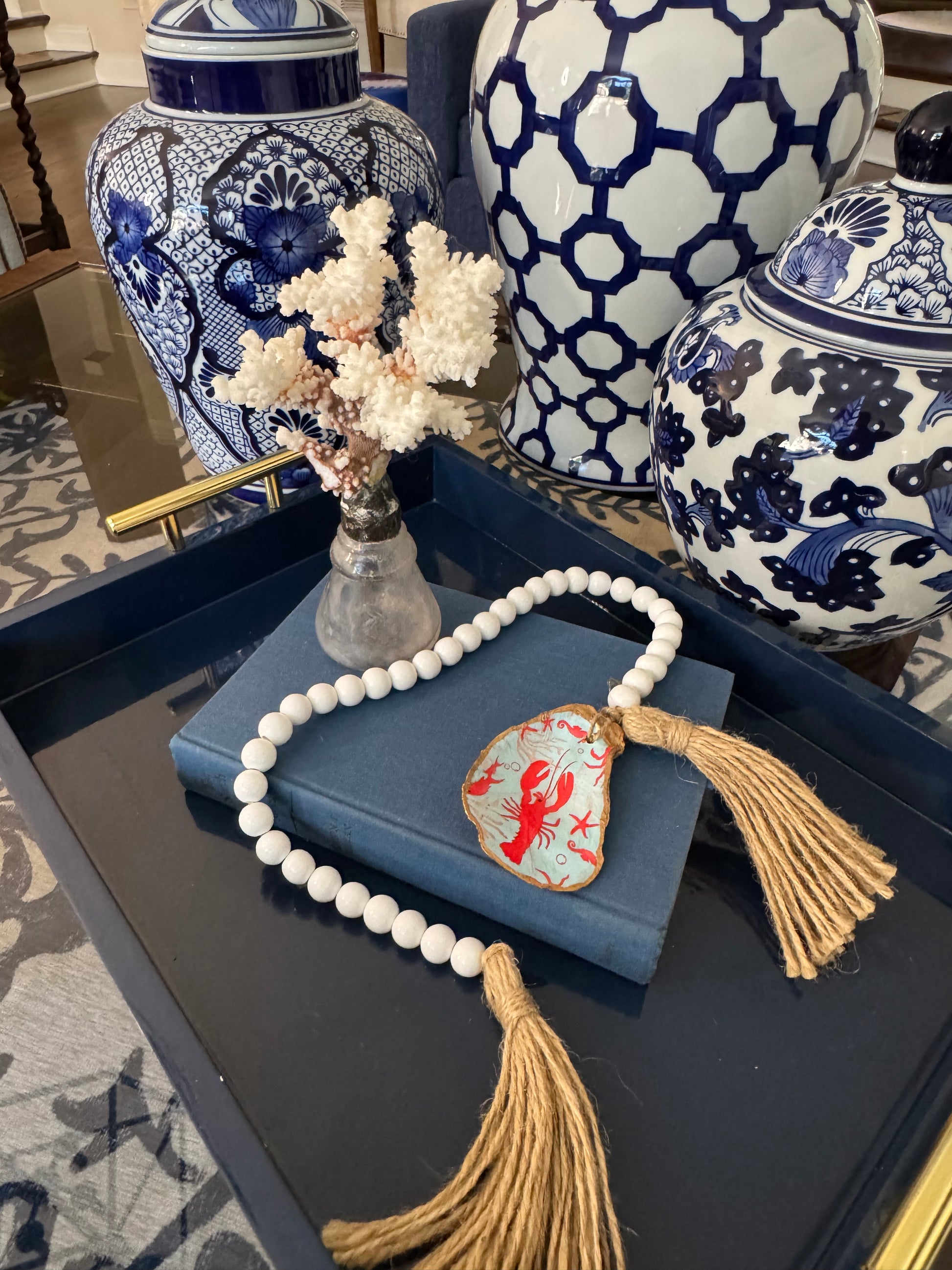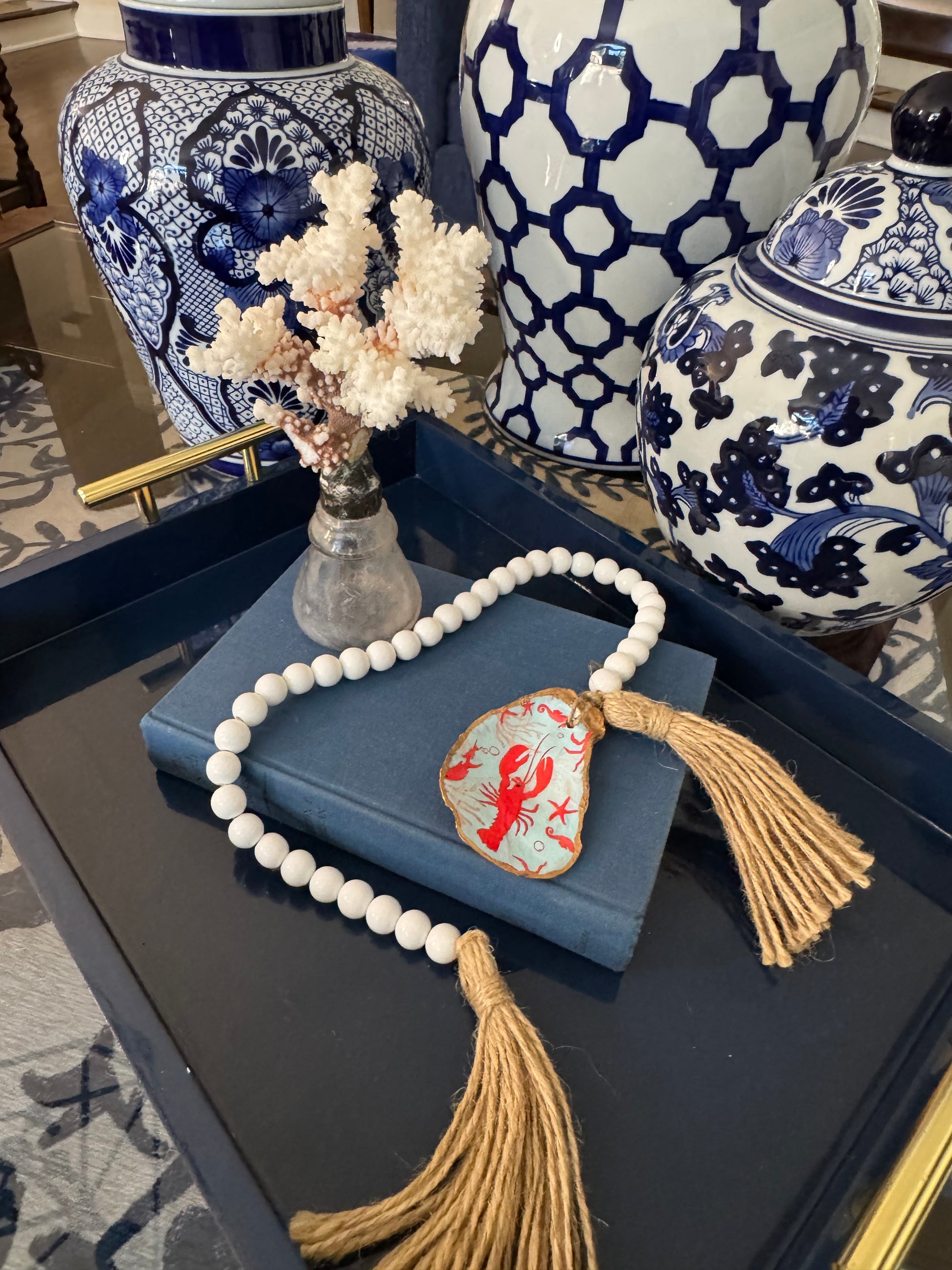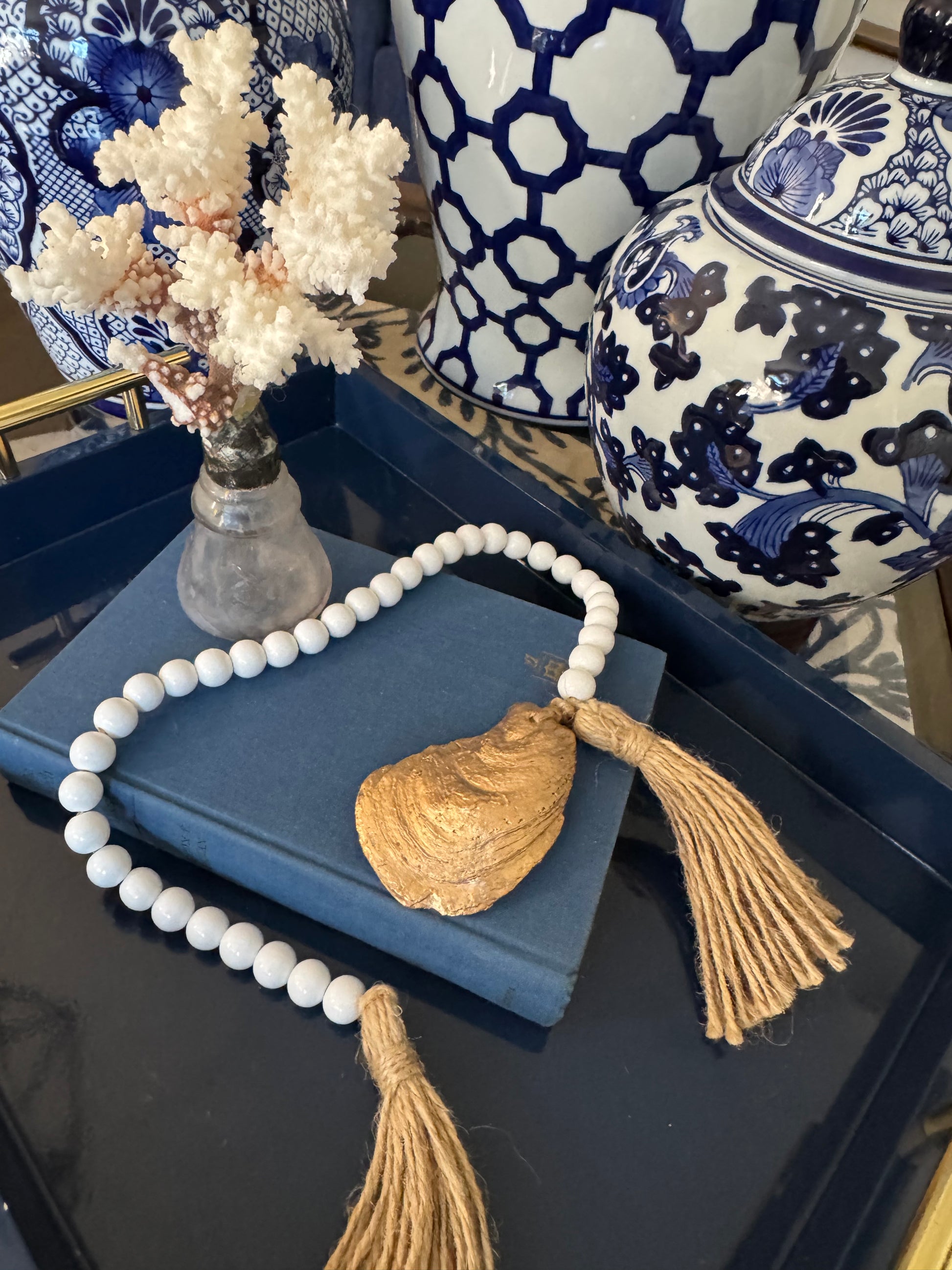 Dress up your space with this handcrafted garland featuring natural wood beads painted white, strung on jute and finished at both ends with jute tassels along, with one Little Darling oyster shell. Perfect for Prayer Bead collectors.
