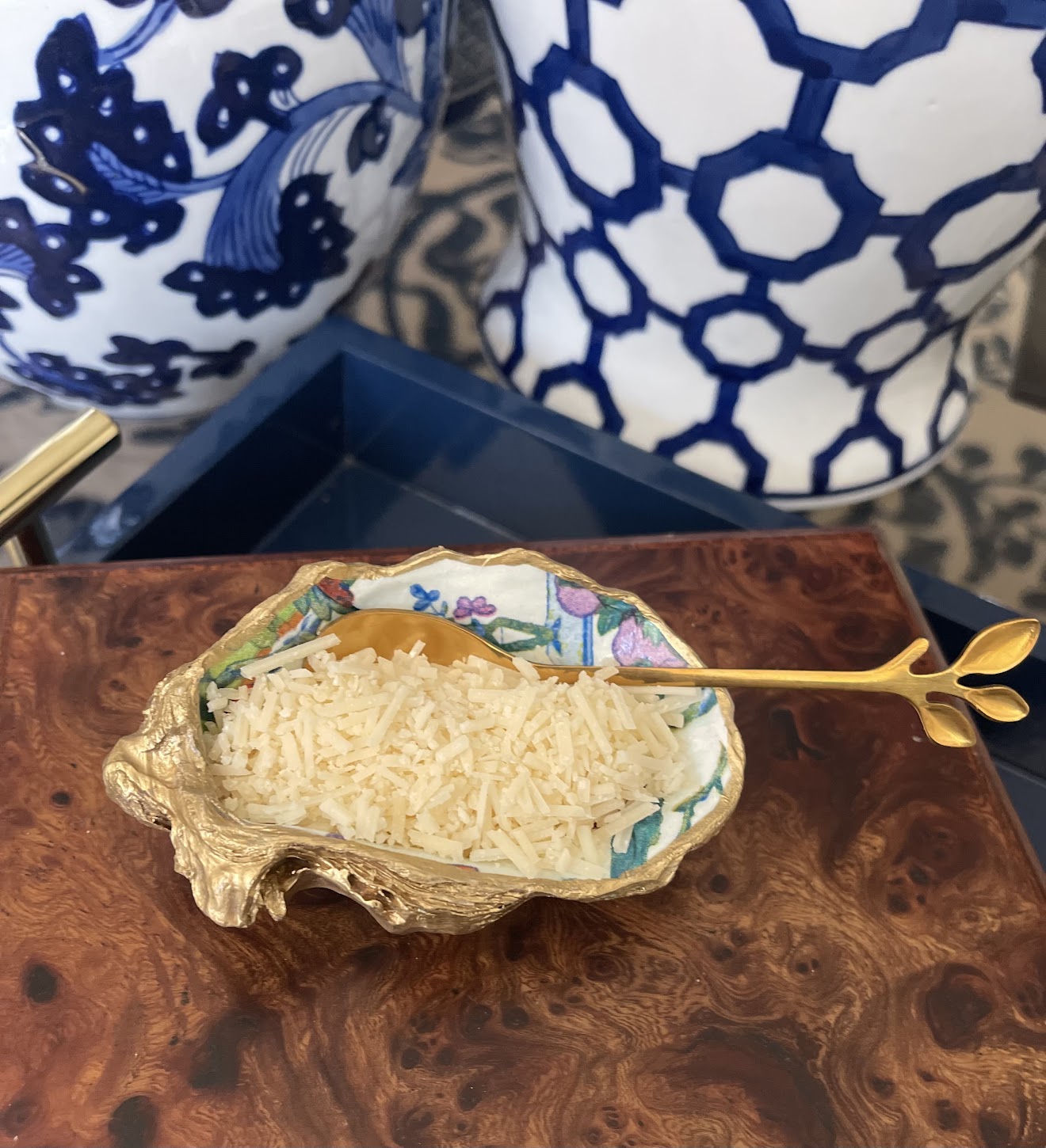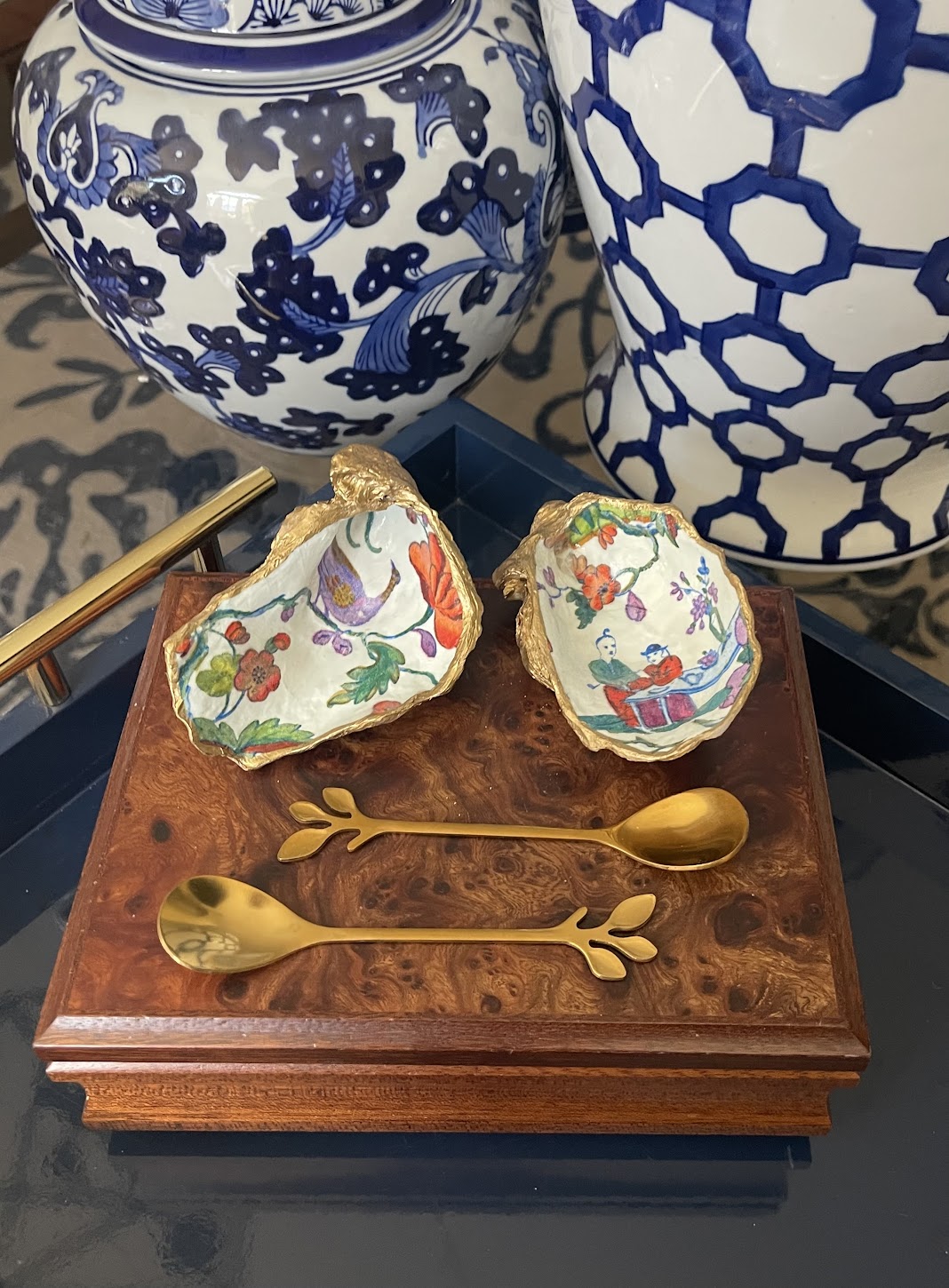 A graceful fusion of multi-colored chinoiserie preserved in beautiful oyster shells, hand-selected to cradle your salt & pepper in coastal charm. The accompanying gold branch-tipped spoons add a dash of sophistication to your table.